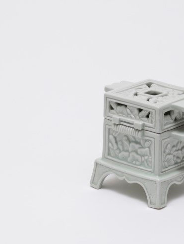백토로 판 성형한 크고 작은 김은주의 백자함은 전체적으로 전통목가구와 금속장식품, 도자공예가 지닌 장식요소들로 혼합되어 백자 안에 화려함을 담아낸다. 전체적인 중심을 잡고 있는 묵직한 사각형의 몸체는 위 뚜껑과 아래몸통의 다양한 비례의 변화로 형태를 변형하거나 쓰임을 고려하는데 밑바탕이 된다. 여기에 시원하게 뻗은 긴 굽이나 소반다리 형태의 굽은 전통목가구의 모습을 닮아 마치 우리 목가구의 미니어처이자 산뜻한 백자함의 화려한 혼합으로 새롭게 다가온다. 전통가구를 견고하게 만드는 금속제 장식인 경첩과 단순화된 자물쇠모양은 백자함을 구성하는 양각기법의 장식기능과 동시에 작품의 앞뒤구분, 함이라는 기능의 역할을 가능케 한다. 사각형의 비례아래 한국 전통공예의 대표적인 여러 장식요소로 전통금속제나 목가구의 화려함을 백자가 지닌 포용력의 자세로 융합한 작품에서 혼성의 미가 엿보인다.